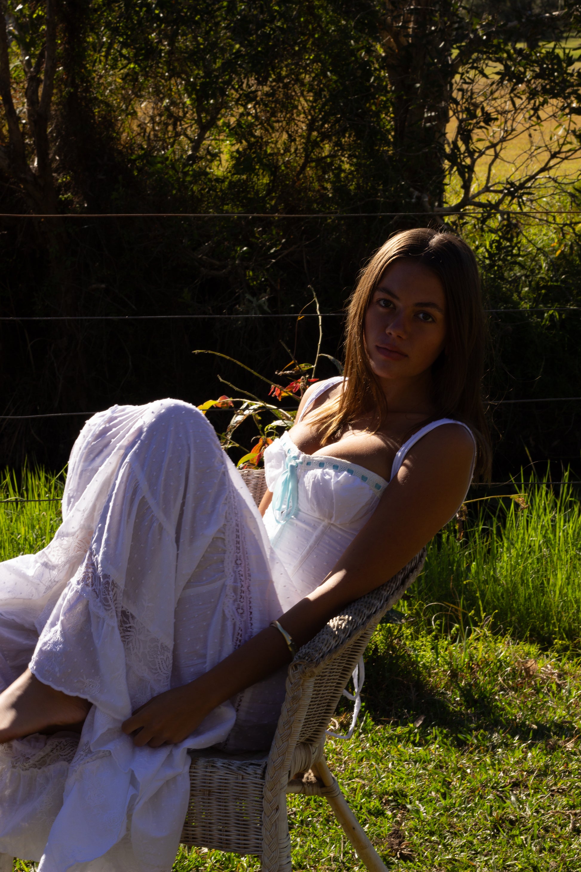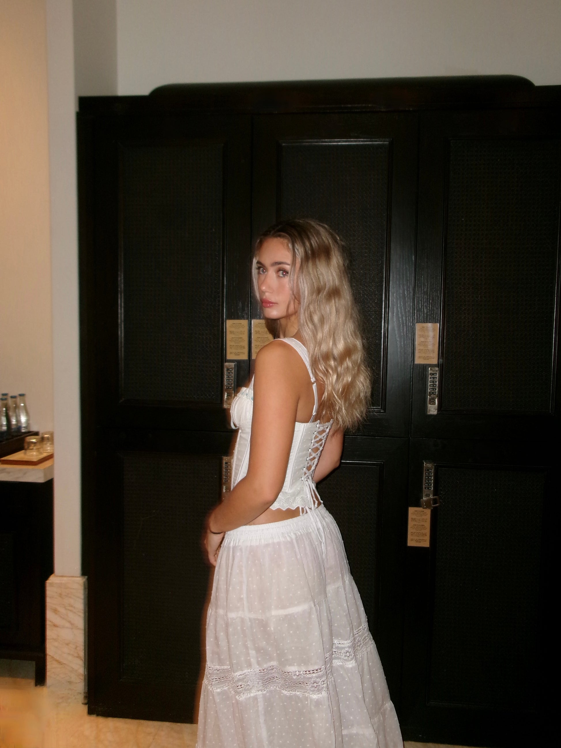 Crafted with the most beautiful white Swiss Dot fabric, the 'Adelina Bustier' is a work of intricate design. Inspired by French romanticism, this bustier is tailored to accentuate the body in all the right places. Perfectly paired with the 'Bianca Lace Skirt' for a true cottage core ensemble.